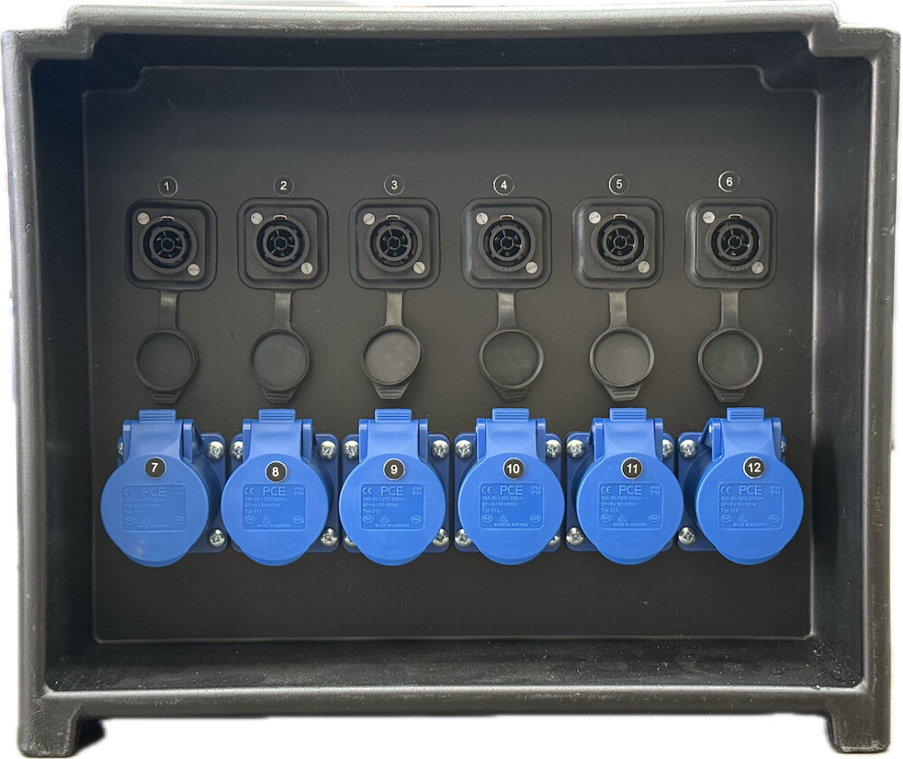 These PCE MERZ 32A distribution boxes are robust, lightweight and made of shock-resistant thermoplastic. Suitable for events and rental they are IP44 splash proof rated.